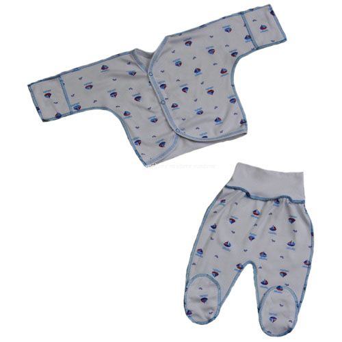 Комплект состоит из распашонки с рукавчиками-трансформерами, с асимметричной застёжкой на кнопочках спереди и ползунков на широкой резинке.